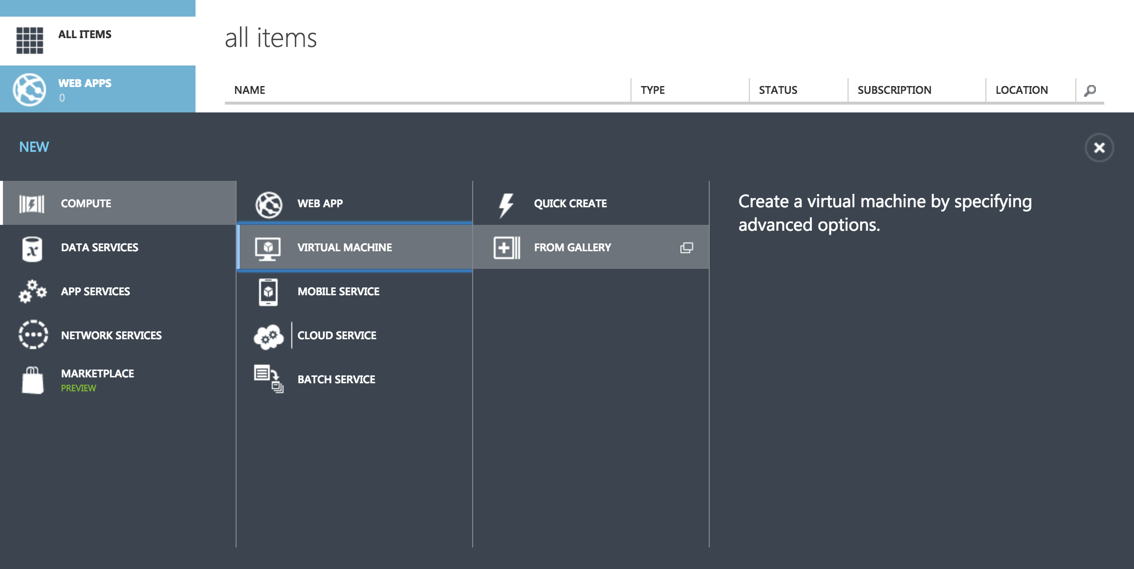 Select new from the lower left-hand corner. Select the virtual machine option and then select from gallery.