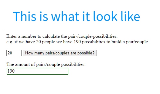 Browser-App: Finds out how many pairs are possible for a given number. E.g. if we have 20 people we have 190 possibilities to build a pair/couple.