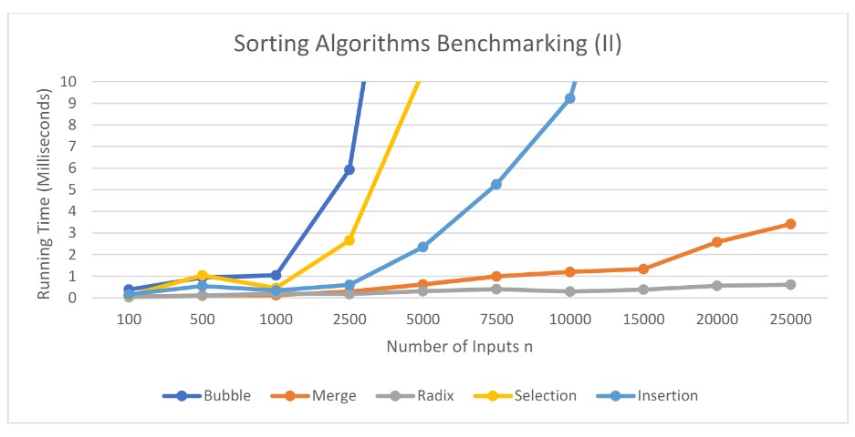 Sizes of randomly generated integers used: 100 | 500 | 1,000 | 2,500 | 5,000 | 7,500 | 10,000 | 15,000 | 20,000 | 25,000