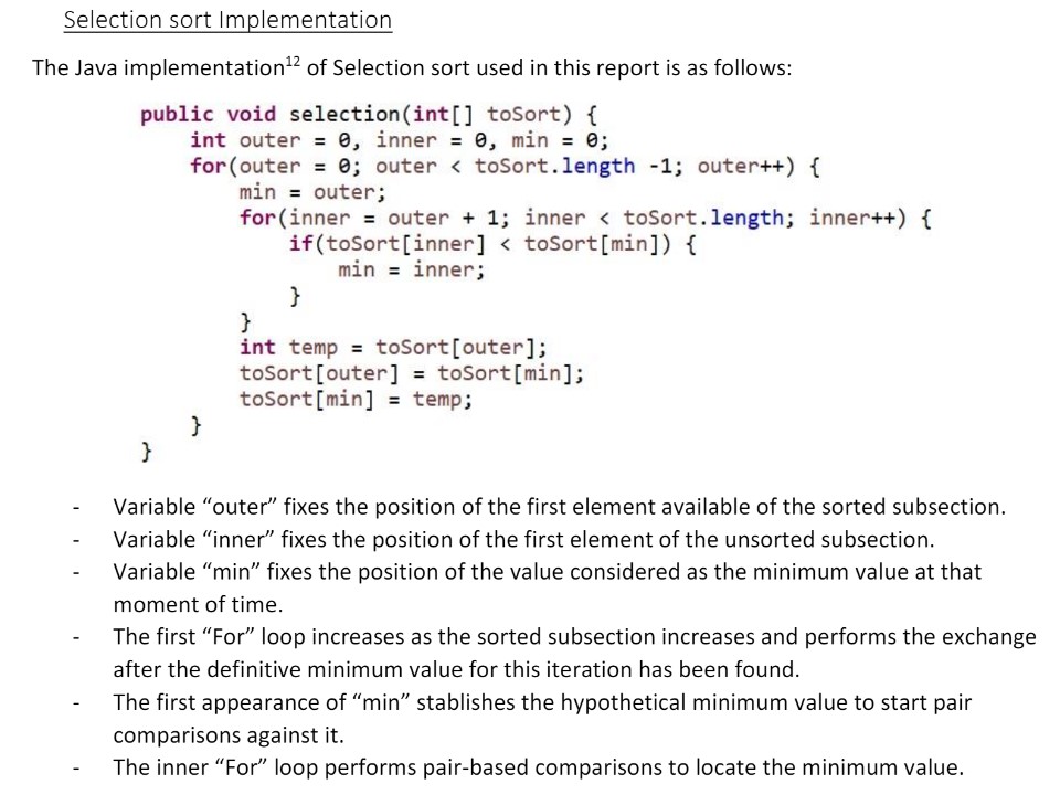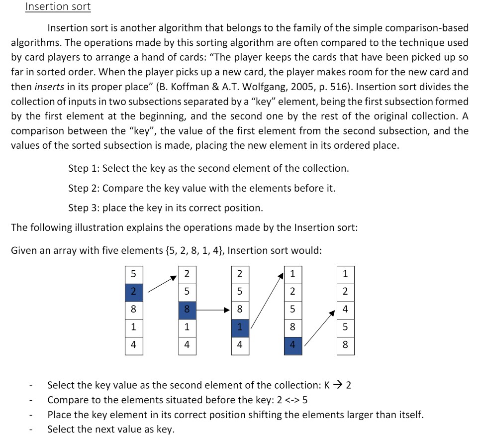 The Report explains step by step the internal logic of the different sorting algorithms used in the Benchmark, with examples and drawings to follow the different steps and discussing their time and space complexity; the explanation of the best, average and worst scenario is analysed too and the implementation of each algorithm is explained.