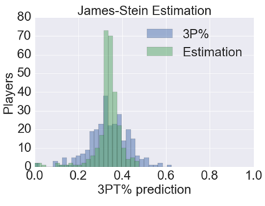 So if a player is shooting 35% from 3 after taking 300 shots, James-Stein estimation will say he's probably about a 35% 3PT shooter. On the other hand if a player is shooting 80% from 3, but has only taken 5 shots, James-Stein estimation will more say that players true 3PT% is much less than 80%.