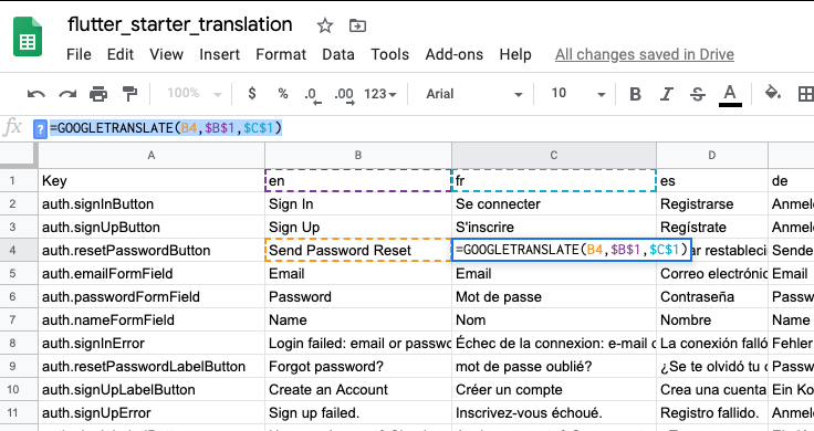 You can copy my sheet as a starting point for your own app. The cool thing about using a google sheet is you can have google translate a field with a simple google formula: =GOOGLETRANSLATE(B4,en,fr) This says translate the phrase in field B4 from english to french. Once you set this package up every time you make changes to your translation in google sheets, you delete your old localizations.g.dart then run the command: flutter packages pub run build_runner build This creates the localizations generated file again.