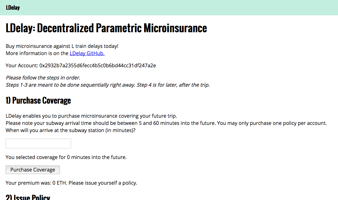 A decentralized application running on Ethereum which enables users to purchase parametric microinsurance covering L train delays. LDelay utilizes a live oracle feed which queries data directly from the MTA to establish whether your train was delayed and if you are eligible for a payout.