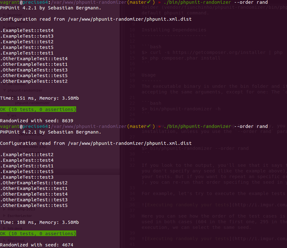 The executable binary is under the bin folder and it works exactly the same as the default phpunit file, accepting the same arguments, except for one: The order argument.