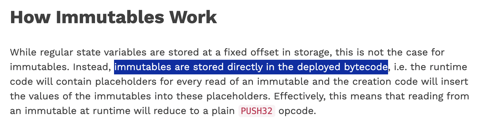 }A key thing to note is that immutable variables are not stored in storage, but rather stored directly in the deployed bytecode.
