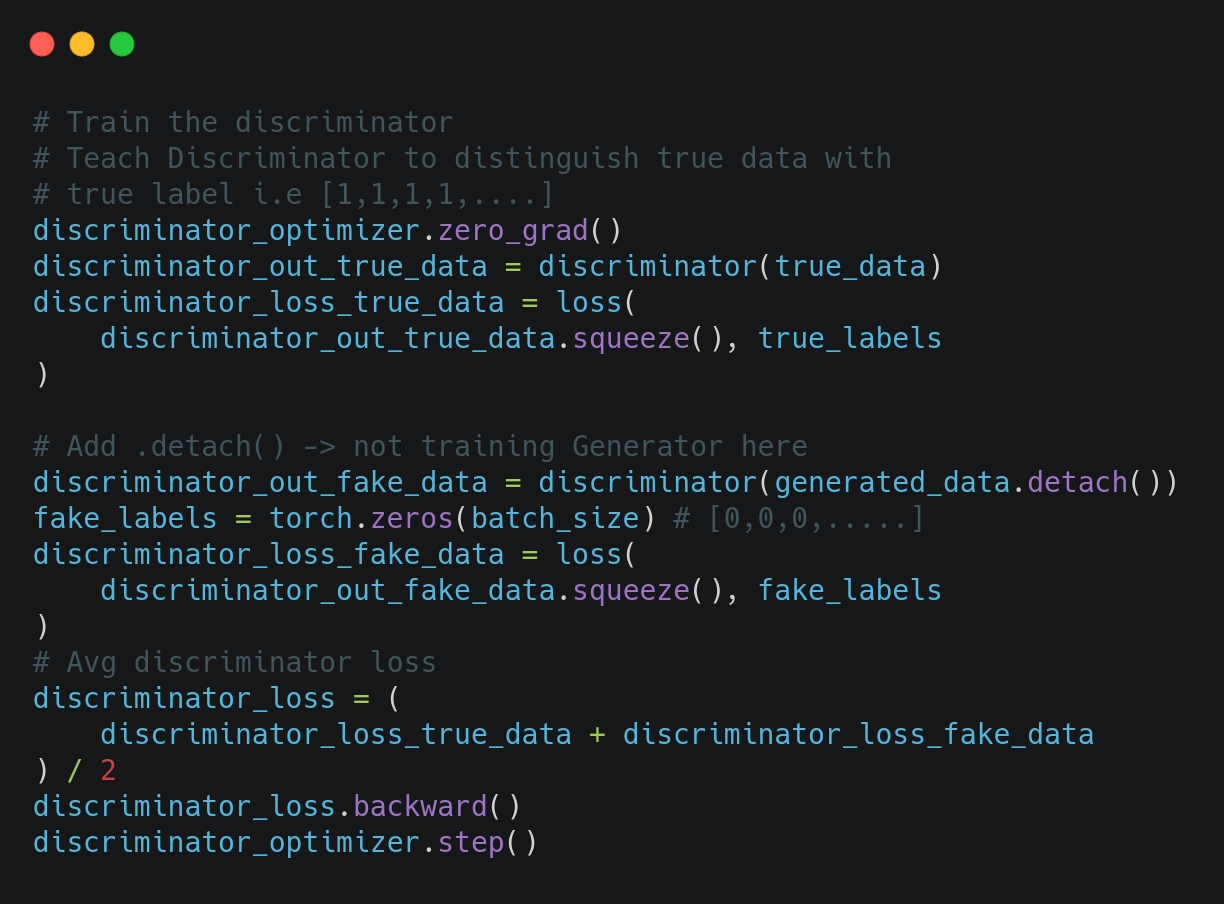detached weights, andzerolabels. Because Discriminator should be able to identify the fake data as zero label. Thus dis_loss is average ofTrue_Dis_Loss andandFake_Dis_Lossi.e (generator_discriminator_loss).