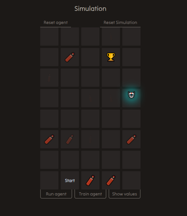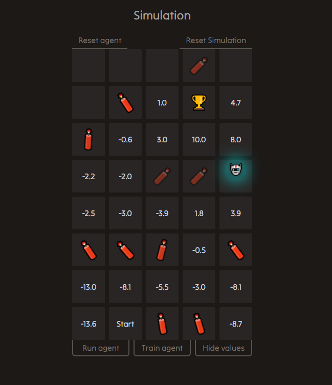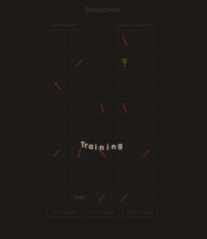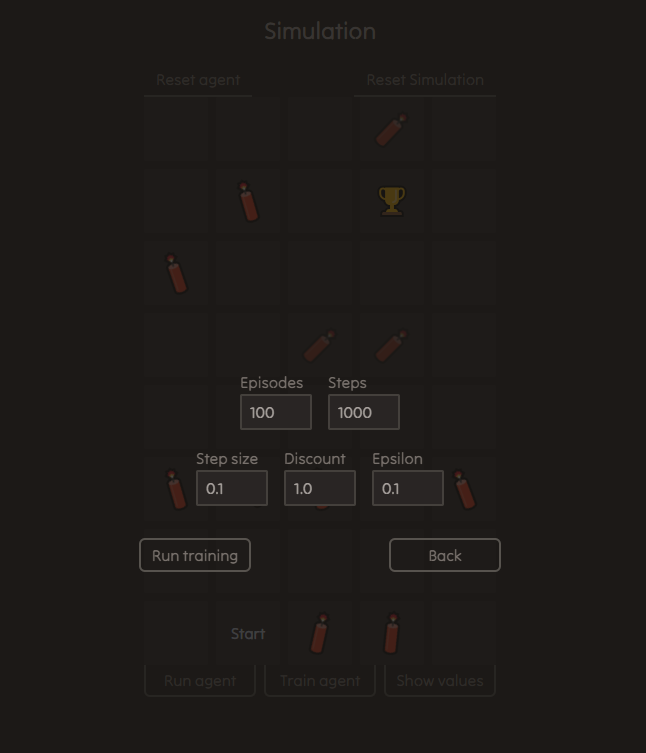 After launching the simulator, you can interact with the UI by selecting different actions for training the agent, observing the agent's progress, and adjusting training parameters. You can start or reset the training and visualize the agent's learned values on the grid.