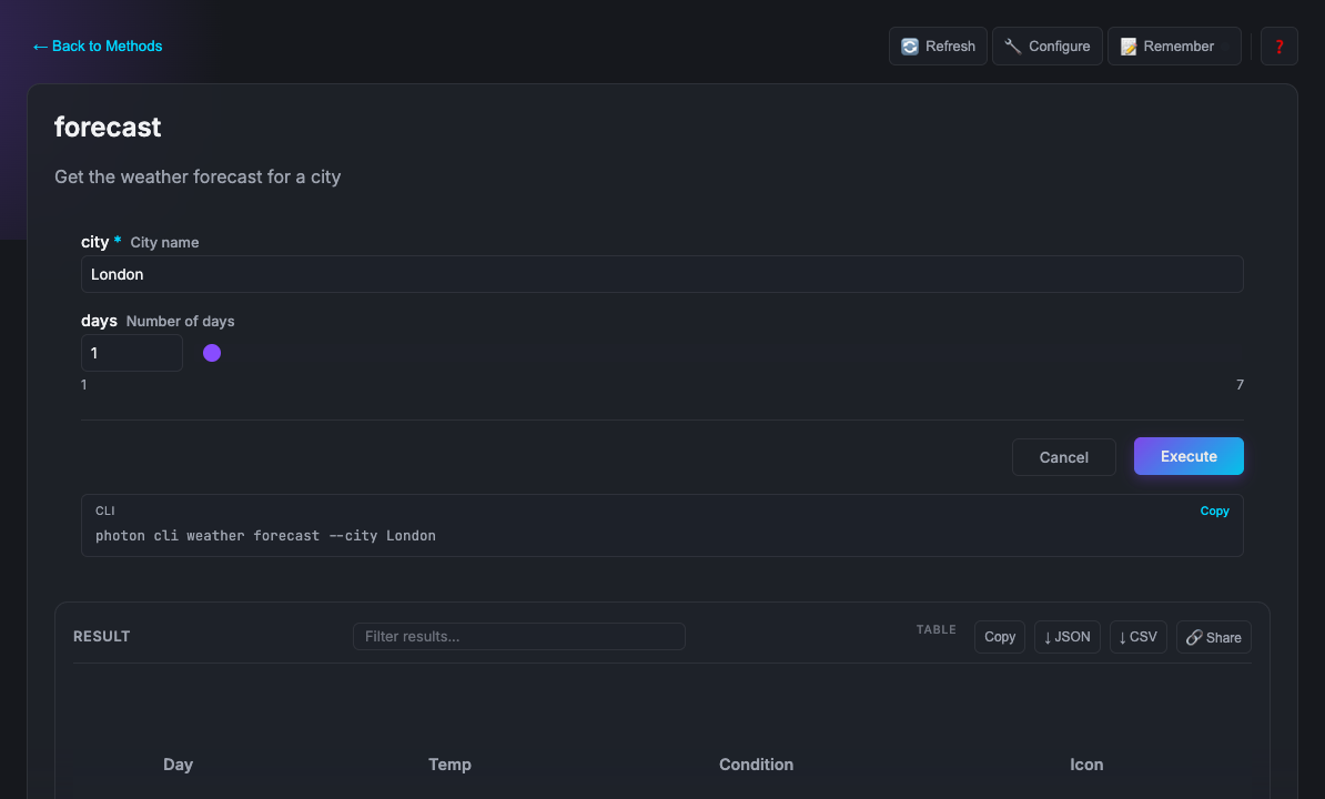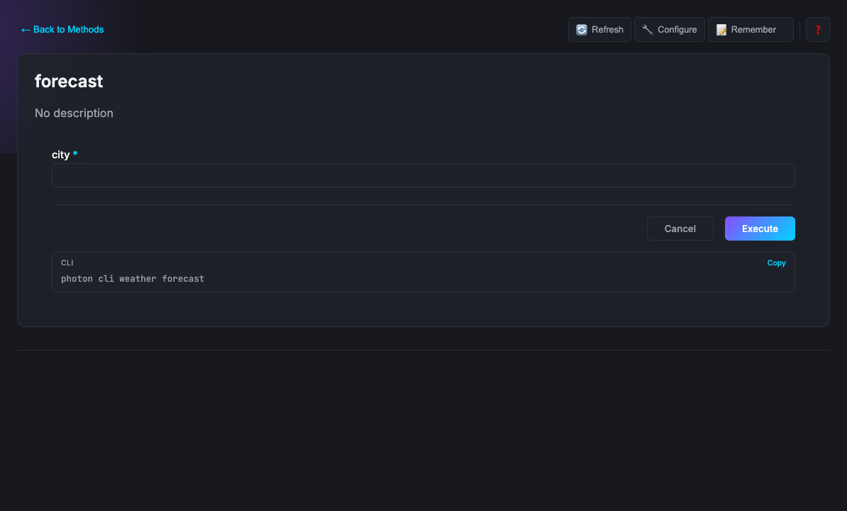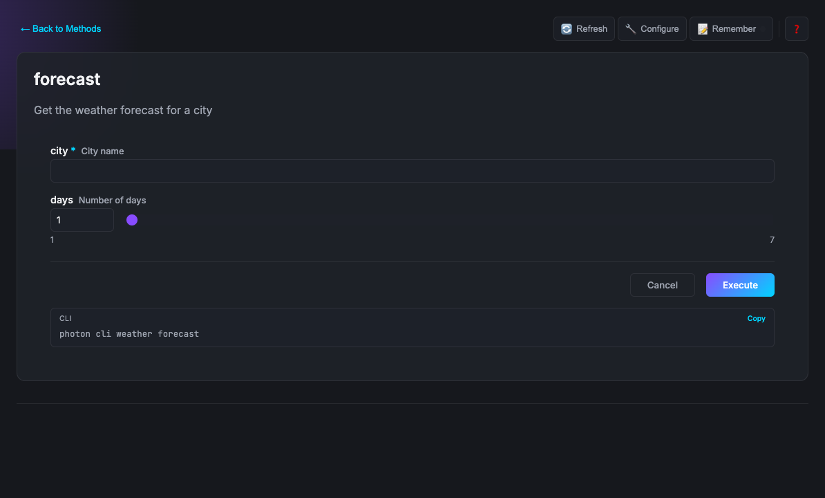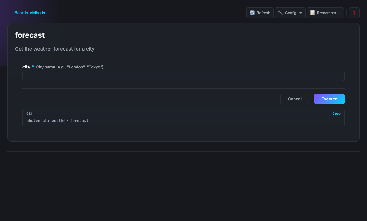 photon mcp weather(The server for Claude)photon cli weather forecast --city Paris(The command line tool)photon(The web UI)