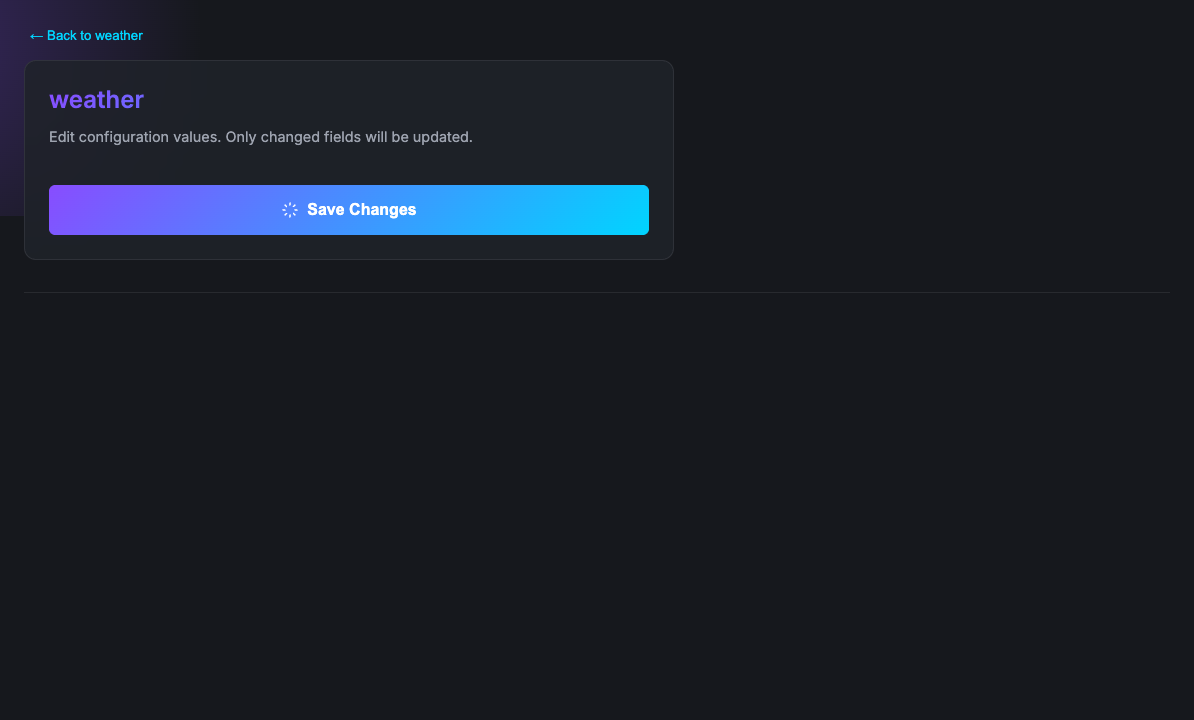}What happens: Beam creates a settings panel. apiKey becomes a password field. It also maps to environment variables like WEATHER_API_KEY. It just works.