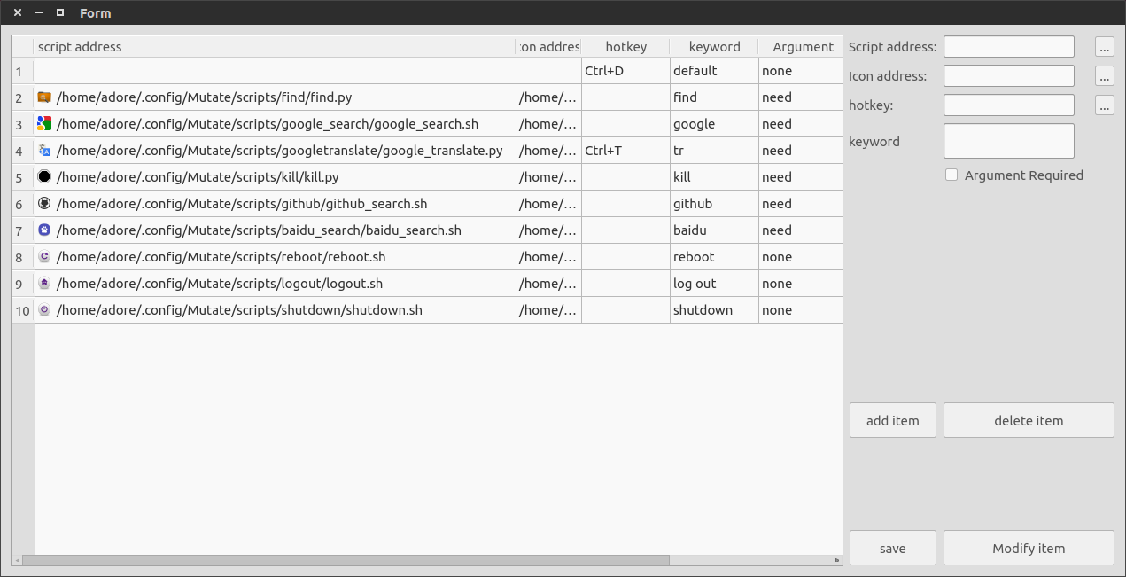 Other rows configure the path, icon path, hotkey, and keyword for different scritps. For example, google_translate's hotkey is configured as Ctrl+T, and when you press it Mutate will type 'tr' and the selected text.