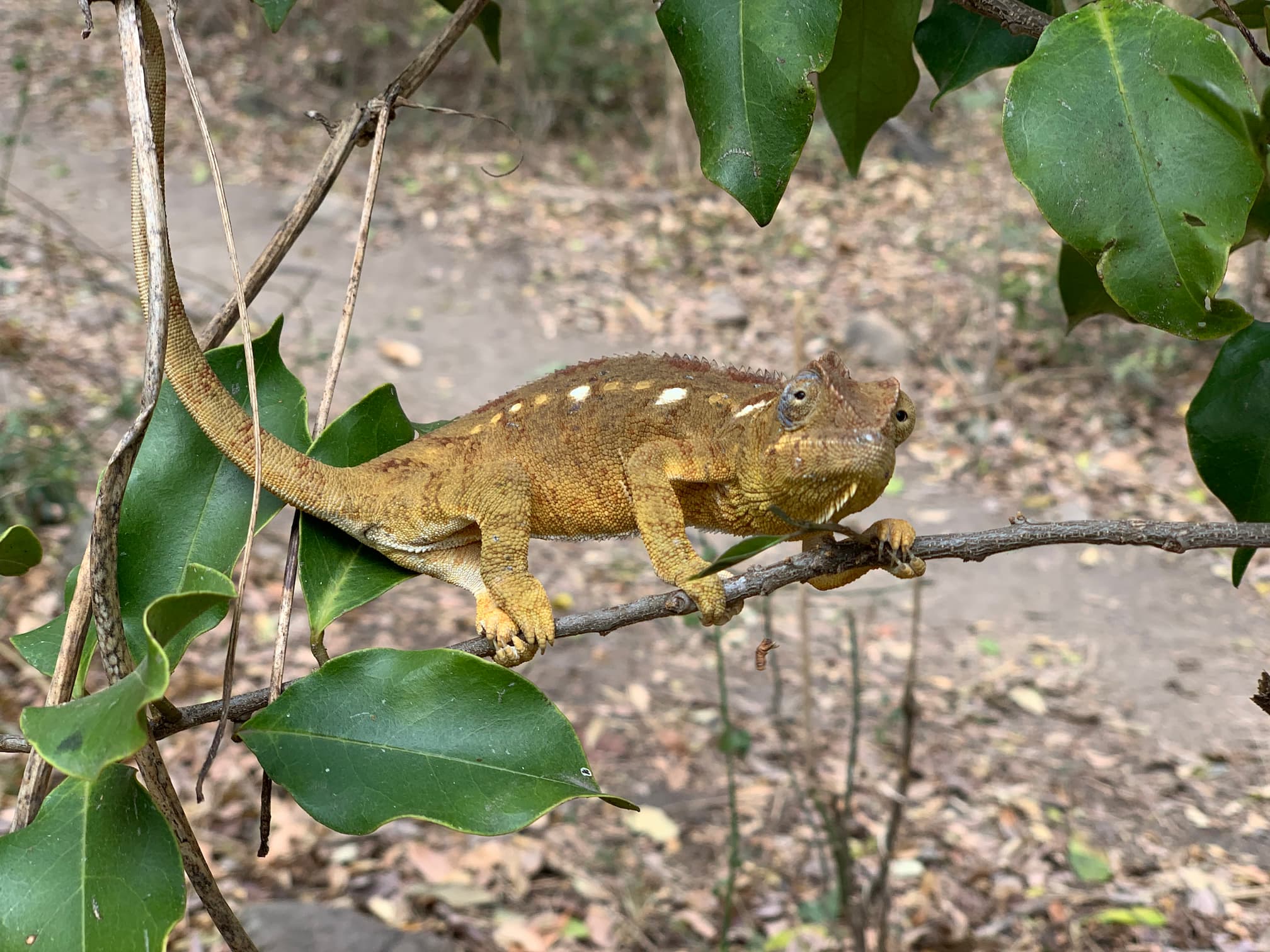 there is a chamelon sitting on a branch in the woods