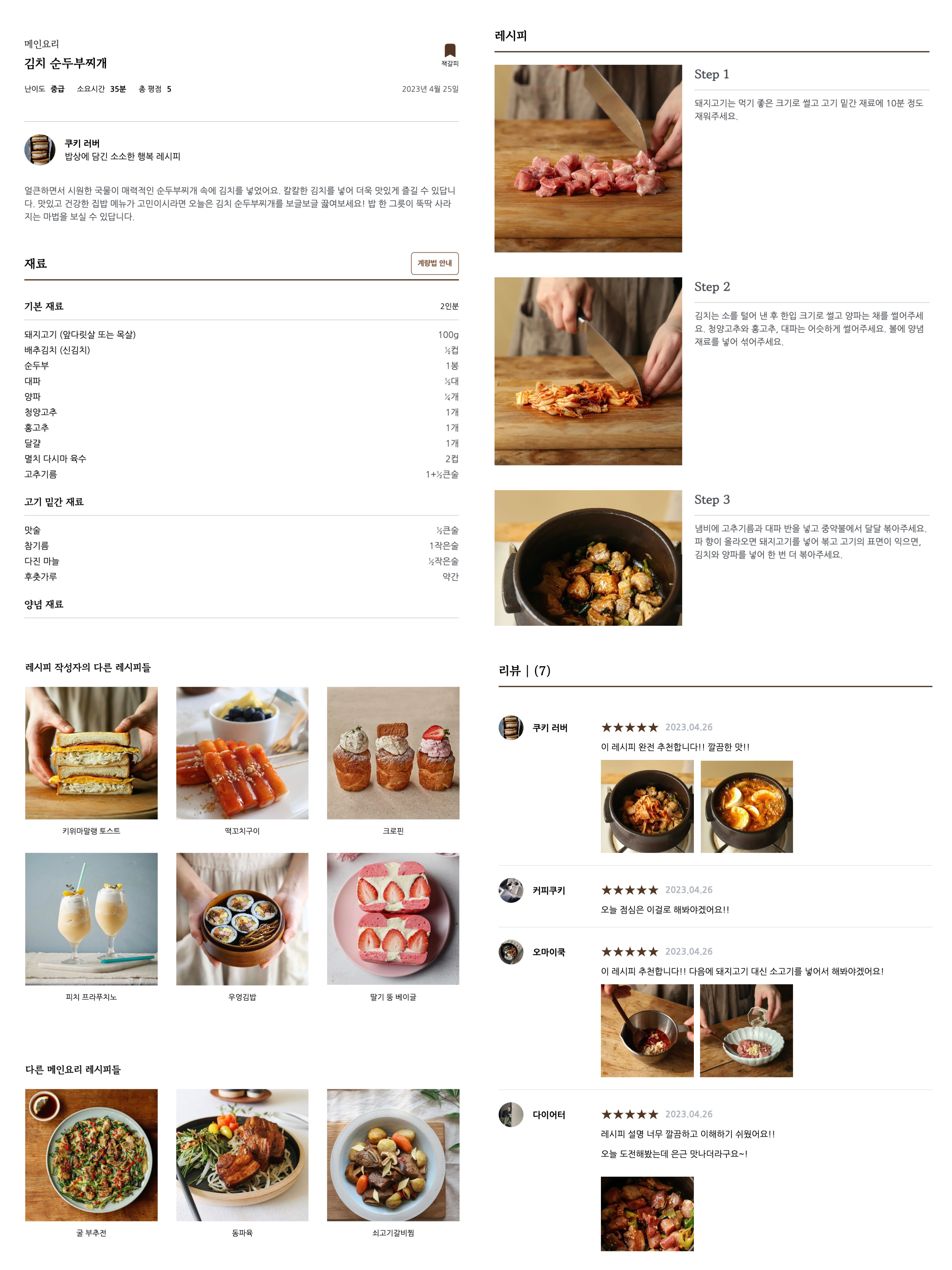 - 공유된 레시피들의 자세한 정보를 볼 수 있으며 작성자의 다른 레시피들이나 비슷한 종류 레시피들을 추천받을 수 있습니다.
