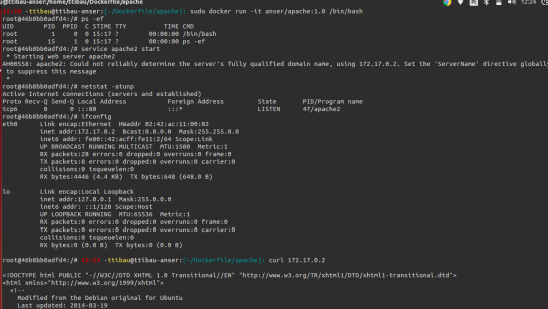 Dê um ps -ef para verificar se o apache está rodando, podemos ver que não, já que não haviamos passado no comando RUN, use o comando netstat -atunp para ver o ip do container e tente acessar o ip no navegador, ou use um curl.